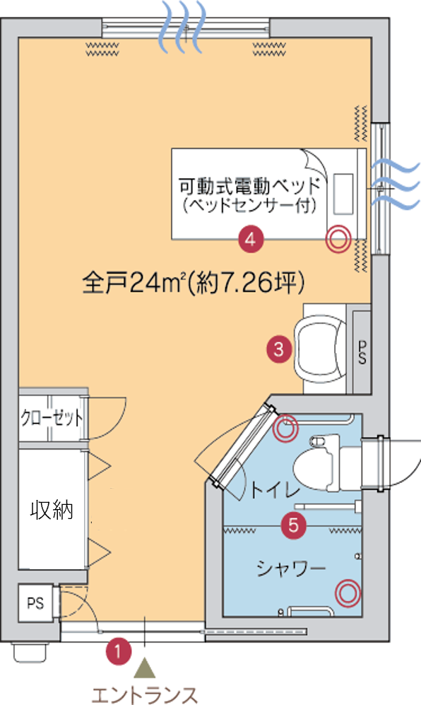 - ベッドでの起き上がりやトイレの入退室、シャワーコーナーの照明などにセンサーを設置。